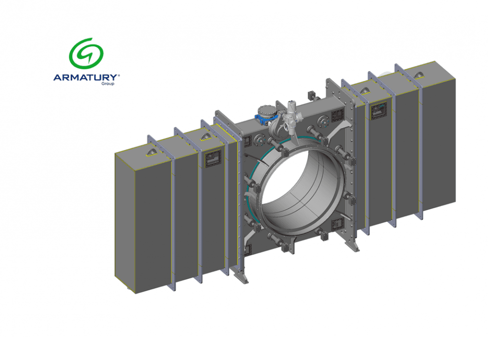 The valve is designed for installation into a horizontal pipeline with frame movement also in a horizontal direction. The working medium may be flue gas with impurities with a working temperature of 780 °C, which can increase in short term up to 900 °C, working pressure 0,2 bar. Due to the high temperature of the medium, the valve bore is provided with special insulation and fireproof lining. The transfer of the frame with eyes from the seat is done by special hydraulic units located outside the body, the movement of the gate for the open and closed condition is provided by an electric actuator with a gearbox.