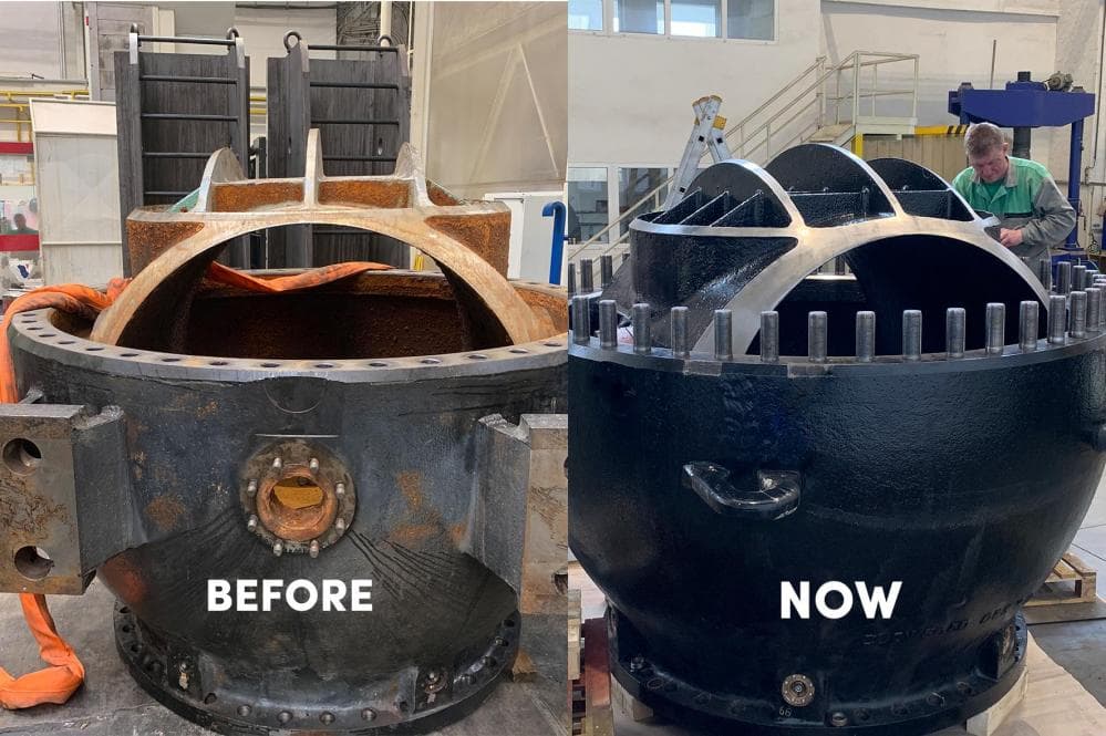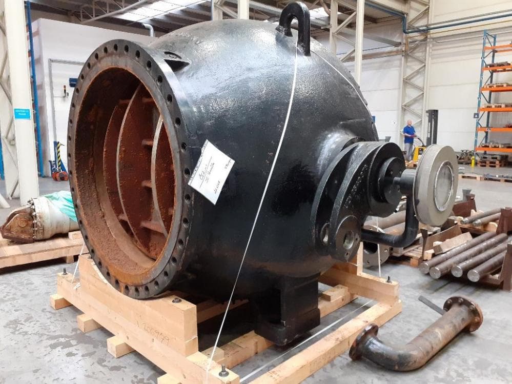 A zde náš příběh pokračuje. Nový kohout je spokojeně na místě a starý zamířil na repasi. Do ARMATURY Group v Dolním Benešově dorazil v minulých měsících. Vstupní prohlídka prozradila věk a kondici. Kulový kohout DN 1400, PN 25, narozen v roce 1990, bydliště čerpací stanice Hněvkovice, hmotnost 27 tun. K repasi převezen včetně montážní vložky, hmotnost 2,5 tuny. Ovládání této armatury zajišťuje přímý dvojčinný hydroválec, váha 3 tuny. Žádní drobečci. Těsnost je zajišťována posuvnými sedly s bronzovými těsnícími plochami. Vzhledem k velké hmotnosti kulového kohoutu, byla prováděna demontáž ve výrobní hale s těžkými jeřáby, následné opravy už probíhaly na repasní dílně také v prostorách ARMATURY Group. Opravu si vyžádaly také těsnící plochy vnitřní koule.