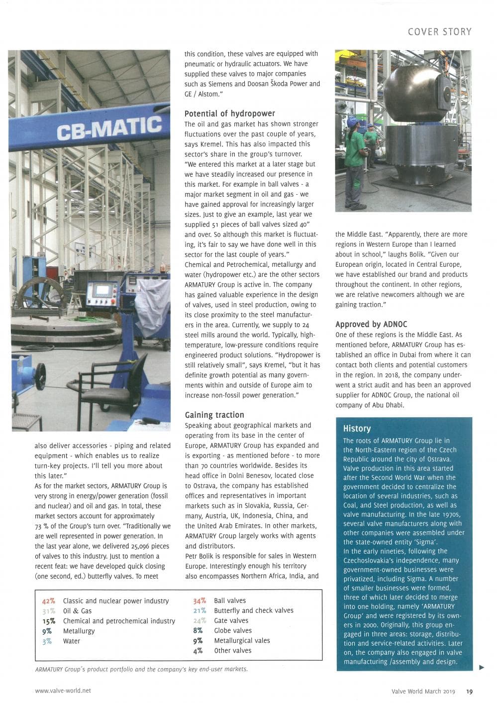 Podle obchodního ředitele Libora Kremla jsou tradiční dodávky do energetiky, jen v posledním roce dodali do tohoto odvětví 25 096 kusů armatur. Uvedené tržní sektory představují zhruba 75 % obratu ARMATURY Group. Výkonný ředitel Petr Groh popisuje ambice společnosti, její historii, významné projekty, klíčová prodejní teritoria i teritoria zájmu.