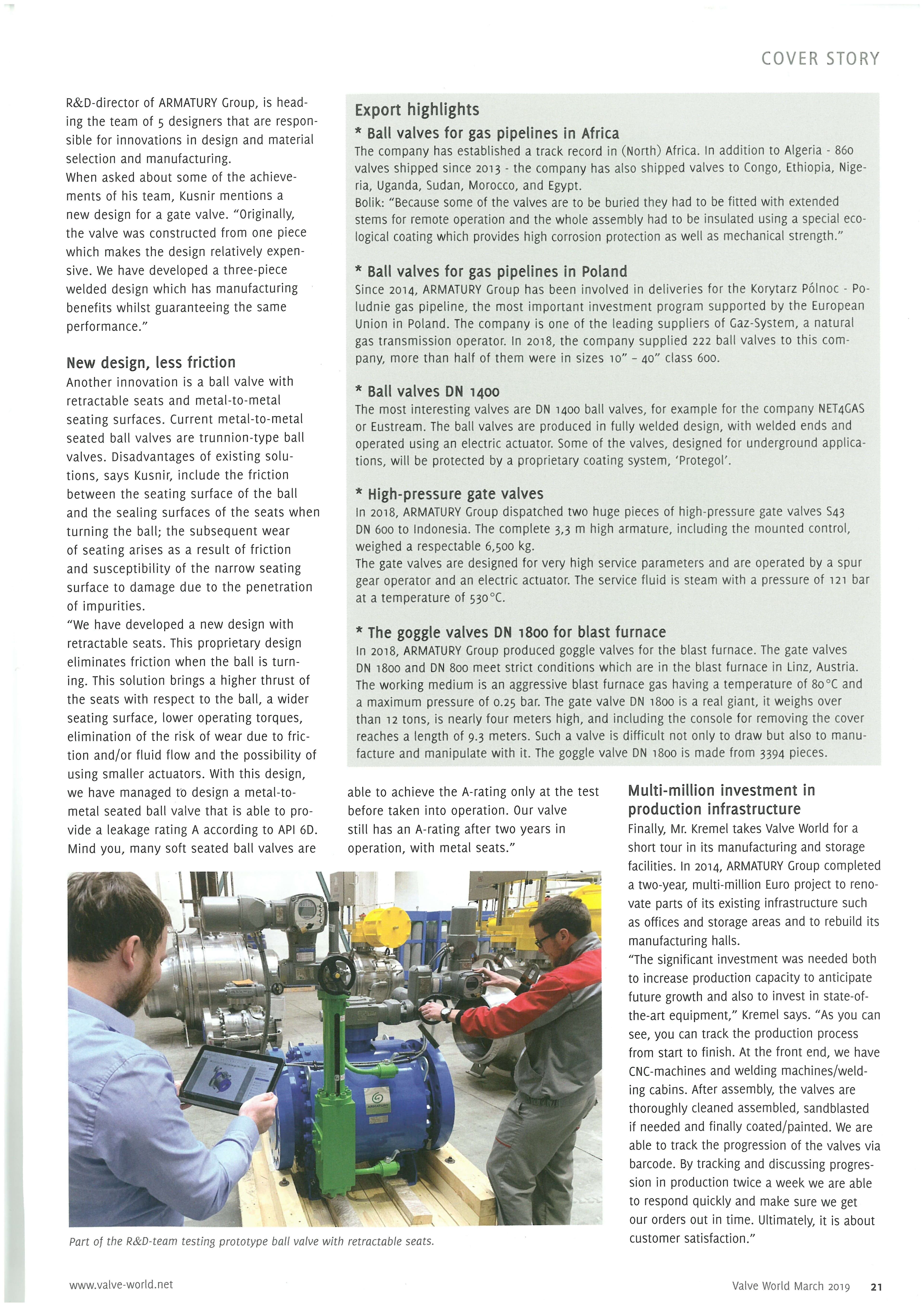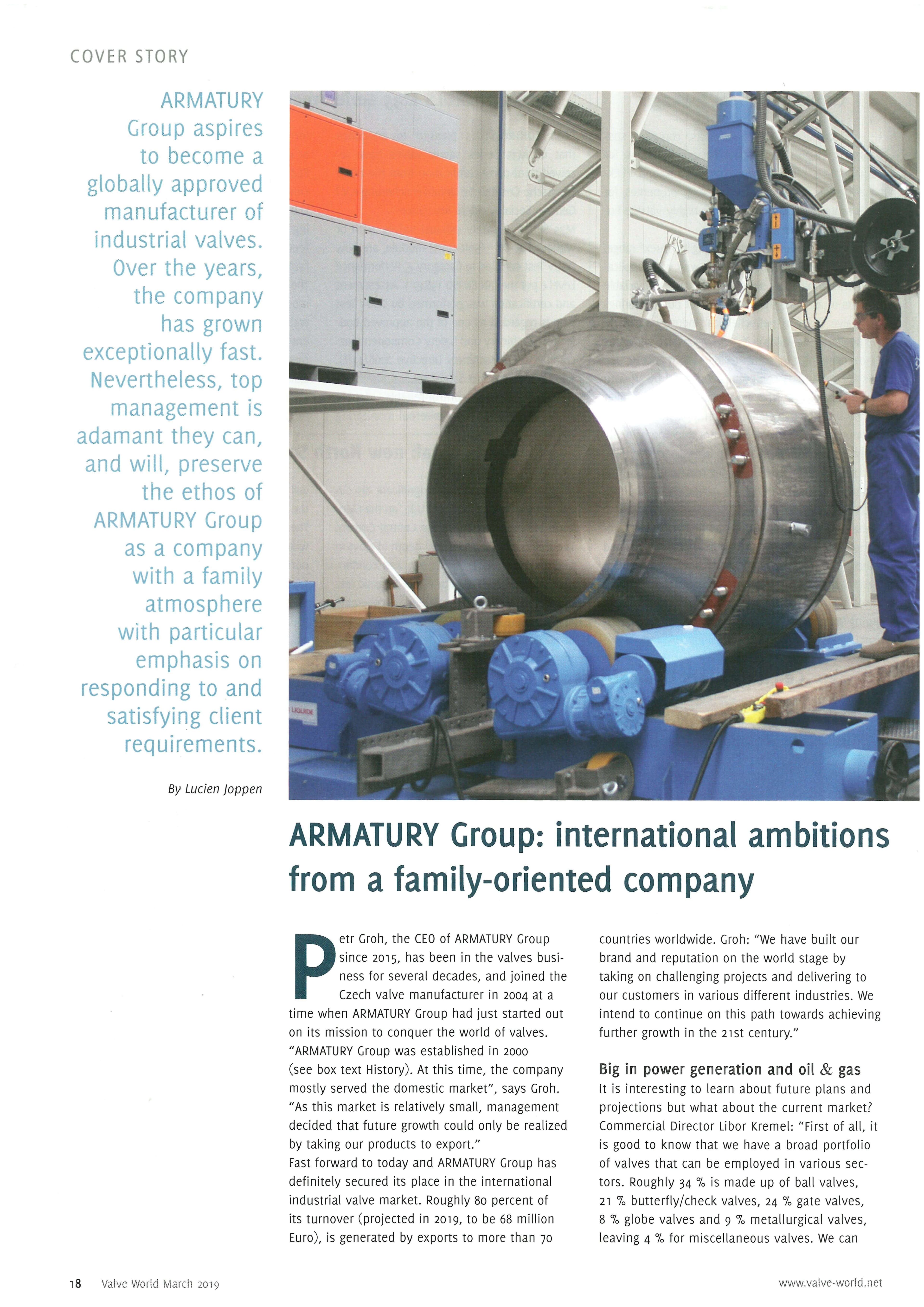 V globálním časopise Valve World se píše, že firma ARMATURY Group je rychle rozvíjející se výrobce armatur s rodinnou atmosférou a mezinárodními ambicemi. Je silná zejména v sektoru ropy a plynu, kde se jí daří dodávat především kulové kohouty větších světlostí. Přestože je tento trh kolísavý, získává firma v této oblasti významné zakázky. Například v loňském roce dodala 51 kusů kulových kohoutů o velikosti 40“ a více.