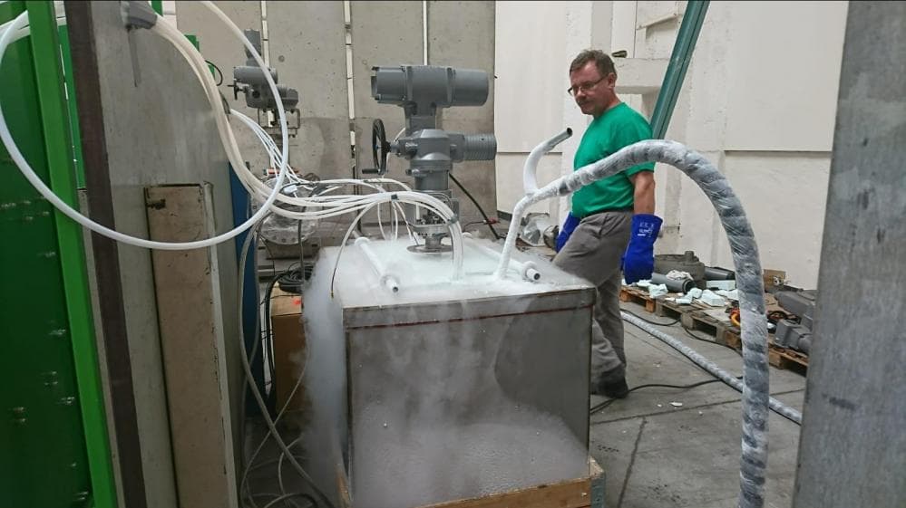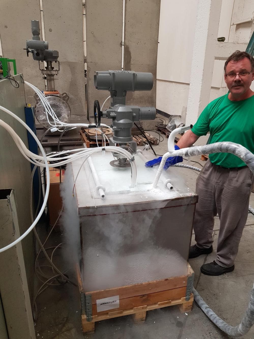 „V ARMATURY Group jsme se proto v roce 2016 rozhodli založit projekt na vývoj kryogenních kulových kohoutů, díky kterým je možné zemní plyn zkapalnit. Na projektu s námi spolupracovala Vysoká škola báňská - Technická univerzita Ostrava, financování bylo částečně hrazeno z dotace MPO. Po zavedení nové technologie výroby a výrobě prototypů K91.C a K92.C bylo nutné výrobky odzkoušet a certifikovat. Samotná kryogenní zkouška dle BS 6364 probíhala ponořením kulového kohoutu do lázně s kapalným dusíkem, který má teplotu -196°C a vystavením kulového kohoutu definovanému vnitřnímu přetlaku pomocí hélia. Na měřícím zařízení se poté sledovaly možné úniky hélia v sedlových partiích a vůči vnějšímu prostředí. Samotná zkouška je technicky i časově velmi náročná a nás velmi těší, že naše kryogenní kulové kohouty prošly testováním na výbornou,“ uvádí Ředitel výzkumu a vývoje Ing. Lukáš Kušnír.
