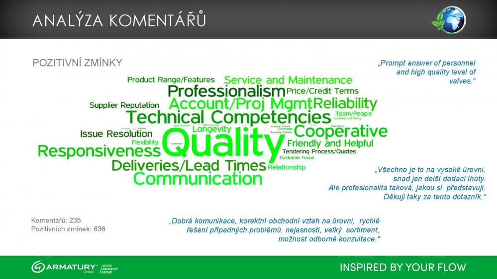 V odpovědi na druhou otázku mohli klienti vyjádřit své pocity a zkušenosti s ARMATURY Group. Celkem jsme obdrželi 235 komentářů, v nichž zaznělo 636 pozitivních zmínek o společnosti ARMATURY Group a 89 negativních postřehů. Podíváme-li se na tyto komentáře blíže, zjistíme, že nejčastěji byla pozitivně vnímána kvalita výrobků, komunikace a technické kompetence. Za všechny uvádíme tento komentář: „Dobrá komunikace, korektní obchodní vztah na úrovni, rychlé řešení případných problémů a nejasností, široký sortiment, možnost odborné konzultace.“ Tyto oblasti můžeme zařadit mezi silné stránky společnosti. Stále však existují oblasti, ve kterých se musíme zlepšovat.