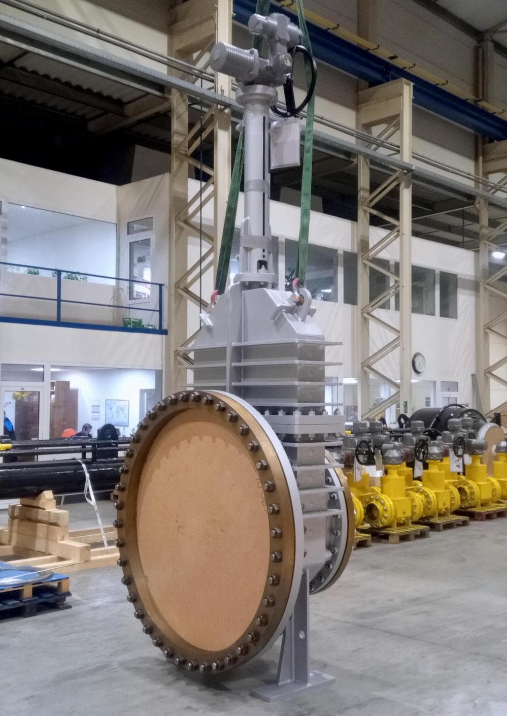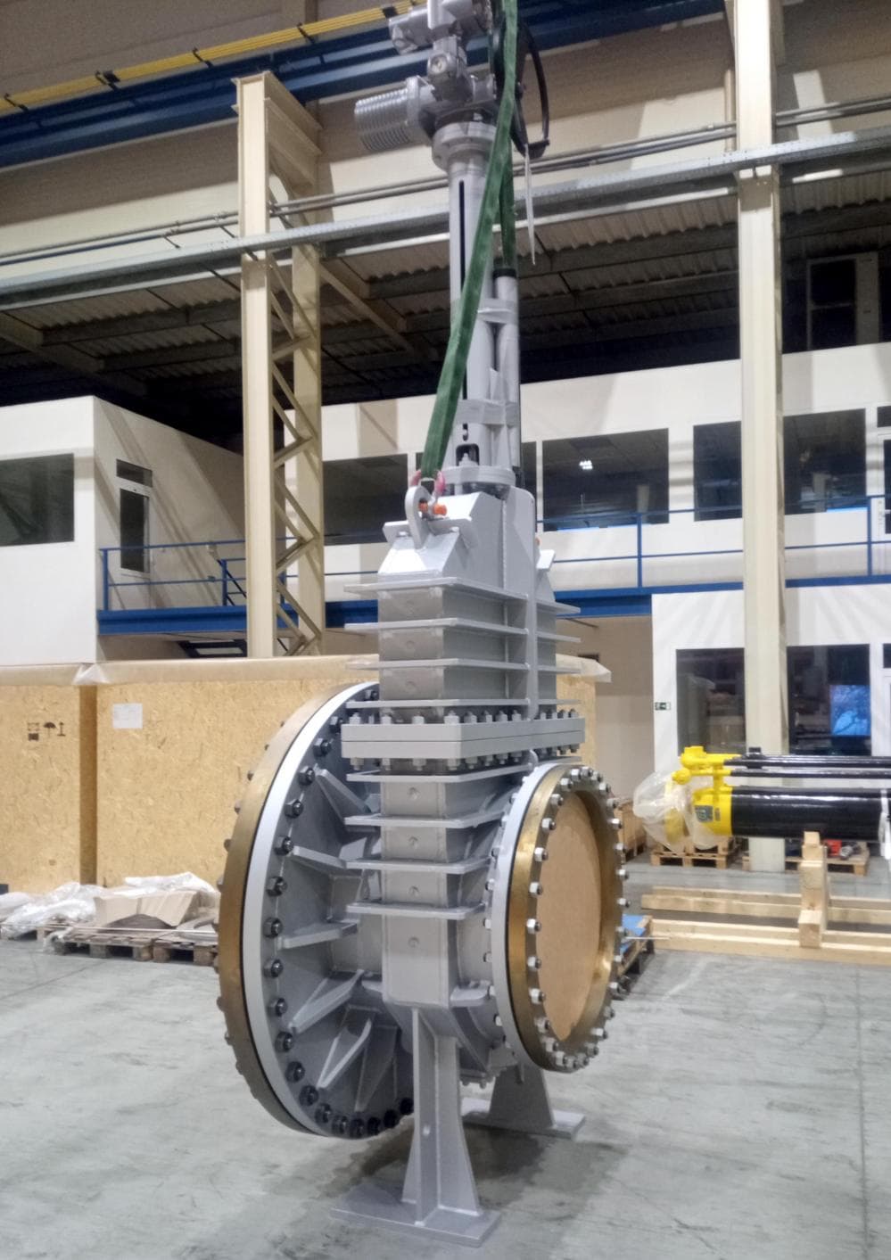 Šoupátko samotné má přibližně 3 600 kg. Včetně pohonu, protipřírub a spojovacího materiálu jsme dodali přibližně 4,5 tuny železa. Vzhledem k ose vřetene je šoupátko nesymetrické z důvodu rozdílných velikostí přírub a jeho celková stavební délka je 800 mm, celková výška dosahuje bez 1,5 cm rovných 5 metrů. Nejedná se o žádný standardní produkt, ale o speciál vyrobený na míru zákazníkovi s konkrétními parametry.