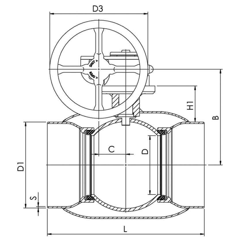 | DN | PN | Produktové číslo | A | B | C | D | D1 | D2 | D3 | E | H1 | L | S | Kg |