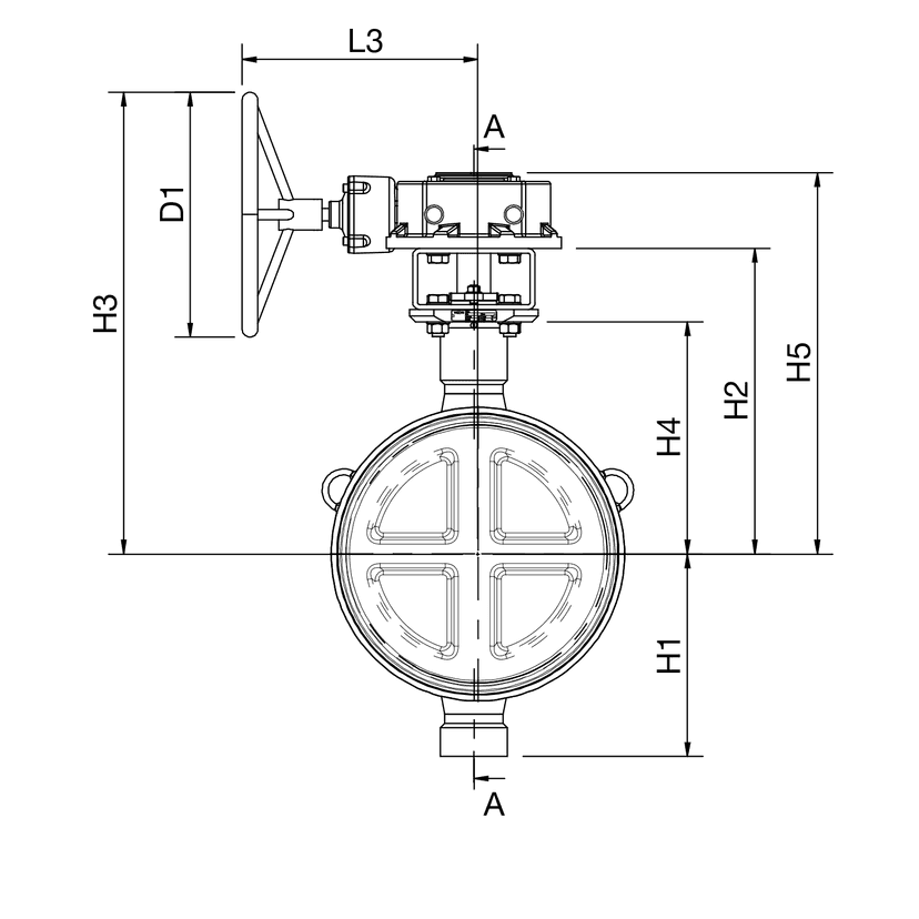 | DN | PN | Produktové číslo | D | D1 | H1 | H2 | H3 | H4 | H5 | L | L1 | L2 | L3 | S | Kg |