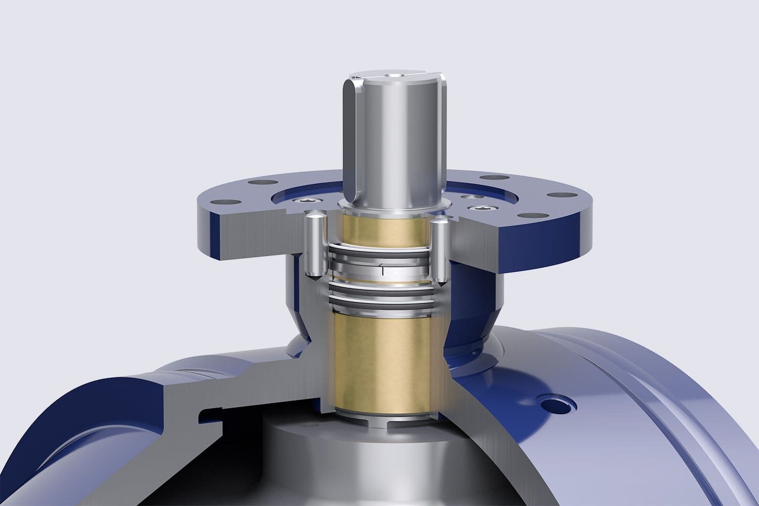 Vexves zapfengelagerte Kugelhähne haben eine ausblassichere Schaftkonstruktion, die jederzeit einen sicheren Betrieb der Kugelhähne gewährleistet. Die Position des Kugelhahns ist immer von oben am Ventilschaft sichtbar. In den Größen DN 450-1200 umfasst die Spindelabdichtungskonstruktion fünf O-Ringe, die absolute Dichtheit garantieren. Die oberen zwei O-Ringe können bei Bedarf einfach ausgetauscht werden.