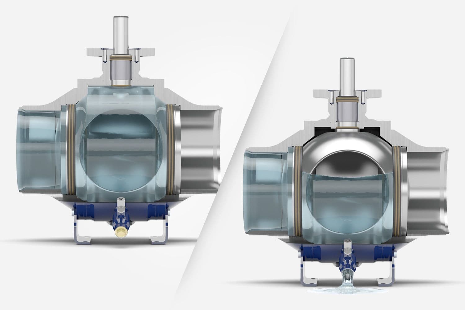 Die „Double Block & Bleed”- Funktion ermöglicht das Entleeren des Gehäuses, um die Dichtheit des Kugelhahns zu prüfen, auch wenn die Rohrleitung unter Druck steht. Das Entleeren des Gehäuses ist in beiden Stellungen – offen oder geschlossen – möglich.