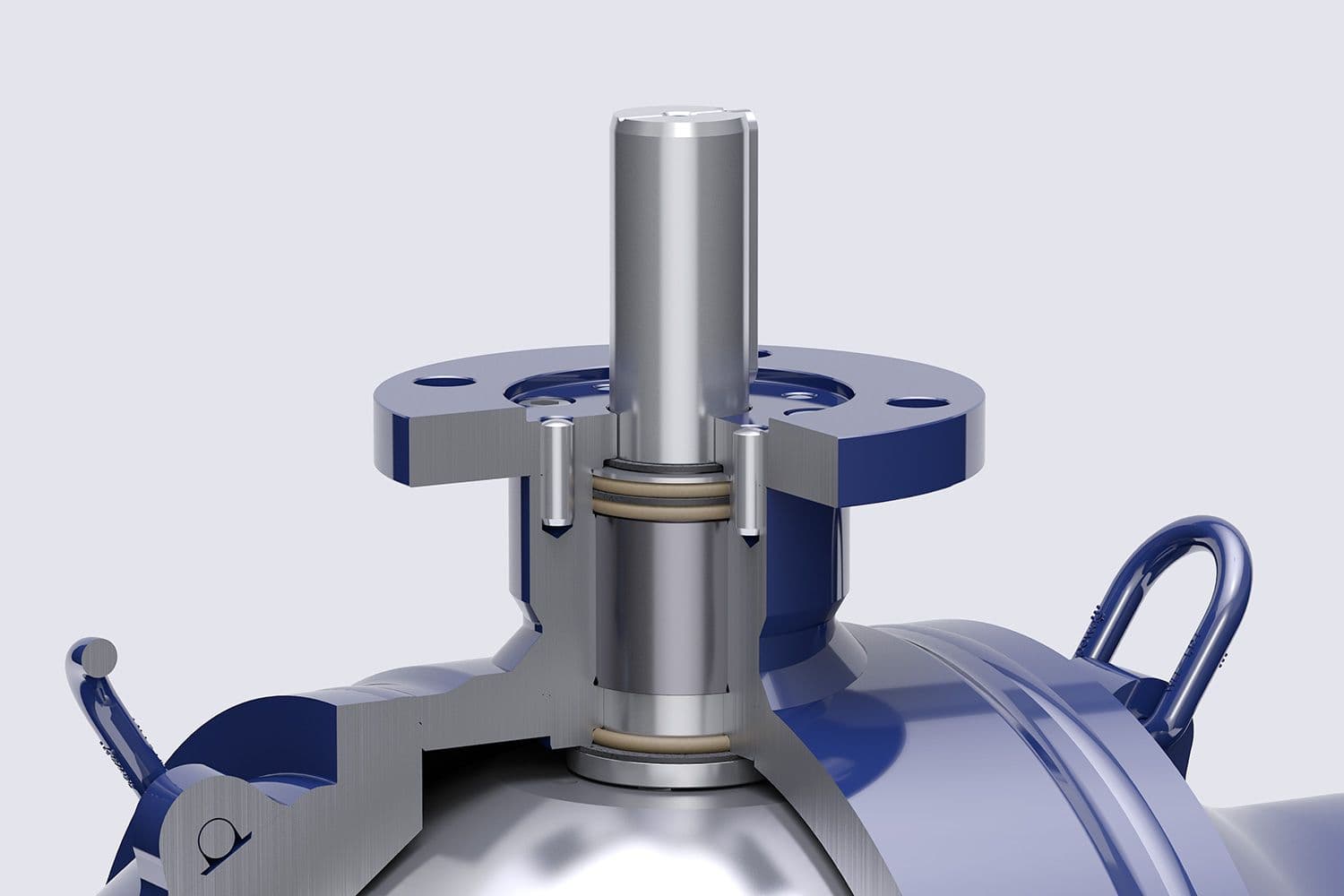 Vexves zapfengelagerte Kugelhähne haben eine ausblassichere Schaftkonstruktion, die jederzeit einen sicheren Betrieb der Kugelhähne gewährleistet. Die Position des Kugelhahns ist immer von oben am Ventilschaft sichtbar. In den Größen DN 150-400 umfasst die Spindelabdichtungskonstruktion drei O-Ringe, die absolute Dichtheit garantieren. Die oberen zwei O-Ringe können bei Bedarf einfach ausgetauscht werden.