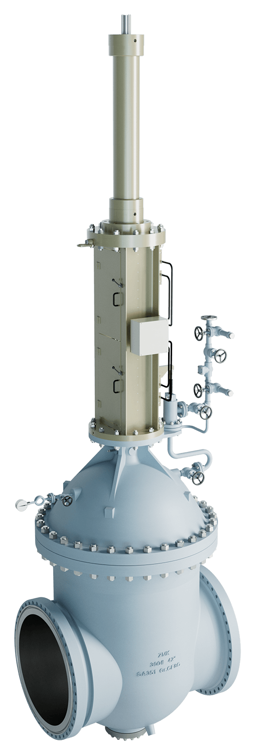 Hydraulisch angetriebene Spezialarmatur im Keil-in-Keil Design mit einer zentralen Kugel zwischen den beiden Keilstücken