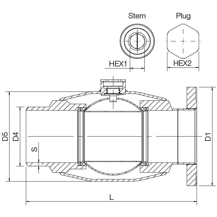 | DN | PN | Produktnr. | D | D1 | D2 | D3 | D4 | D5 | H | L | S | HEX1 | HEX2 | Kg |