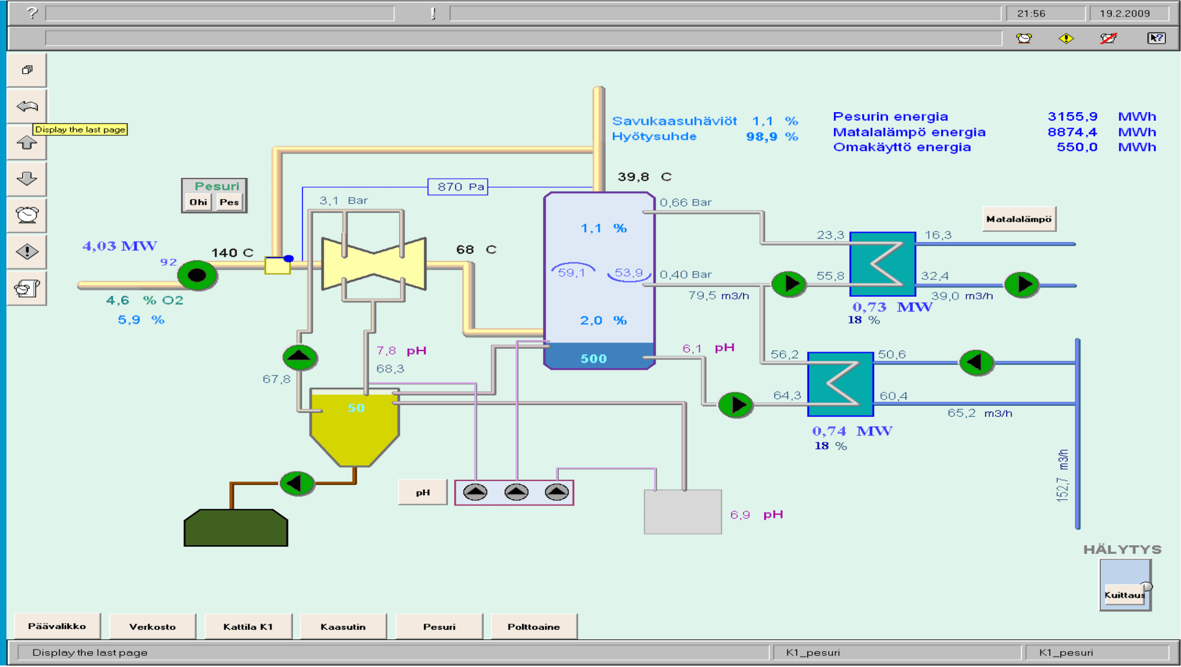 The speciality of the central heating plant is a two-stage flue gas scrubber, where the latter stage is utilized in the plant's own fuel production. Thus, the flue gas temperature can be lowered to about 40 degrees and in winter even closer to 20 degrees when the glycolic circuit return is sometimes below zero.