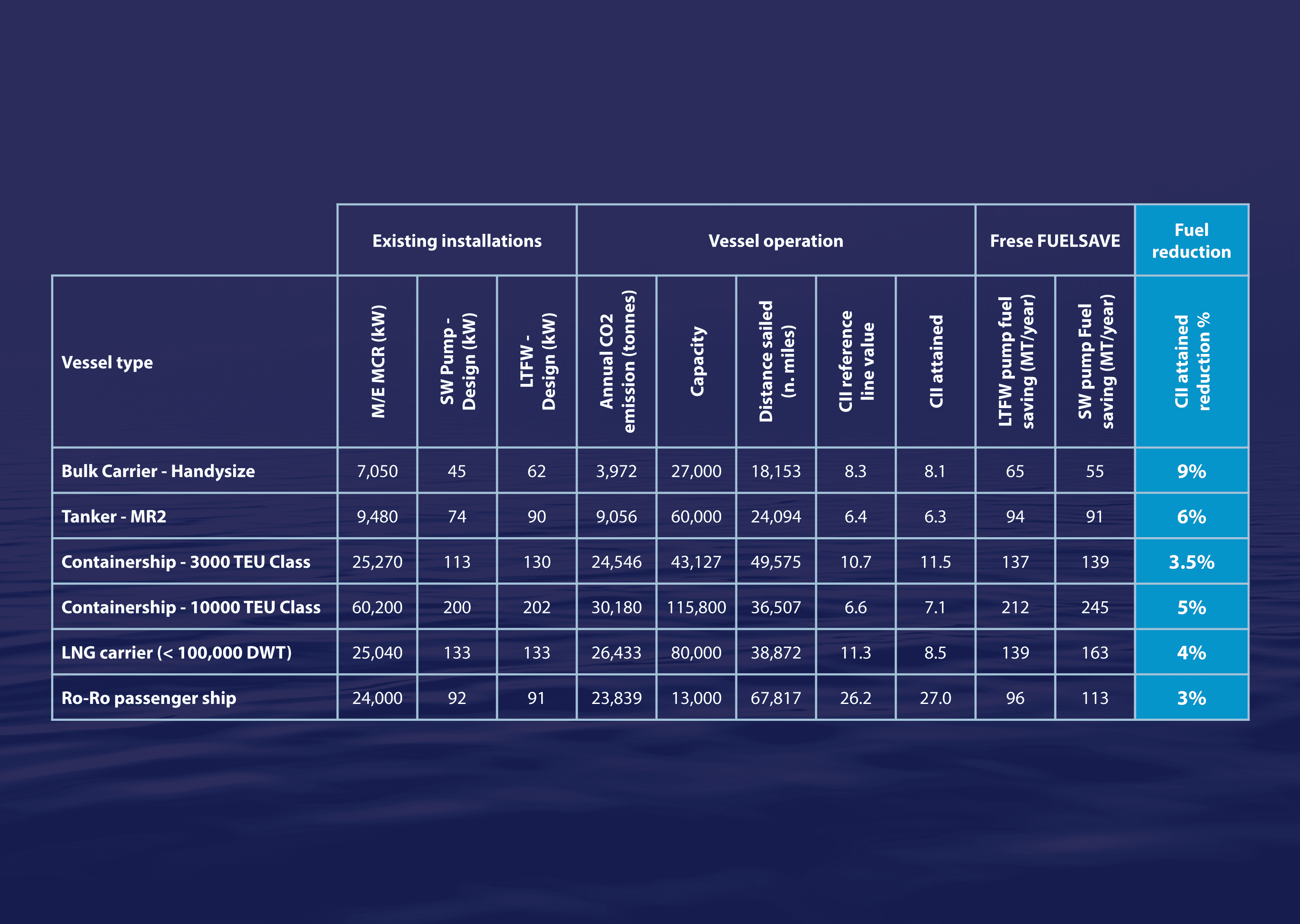 Typical Impact of Frese FUELSAVE® on Various Ship Types