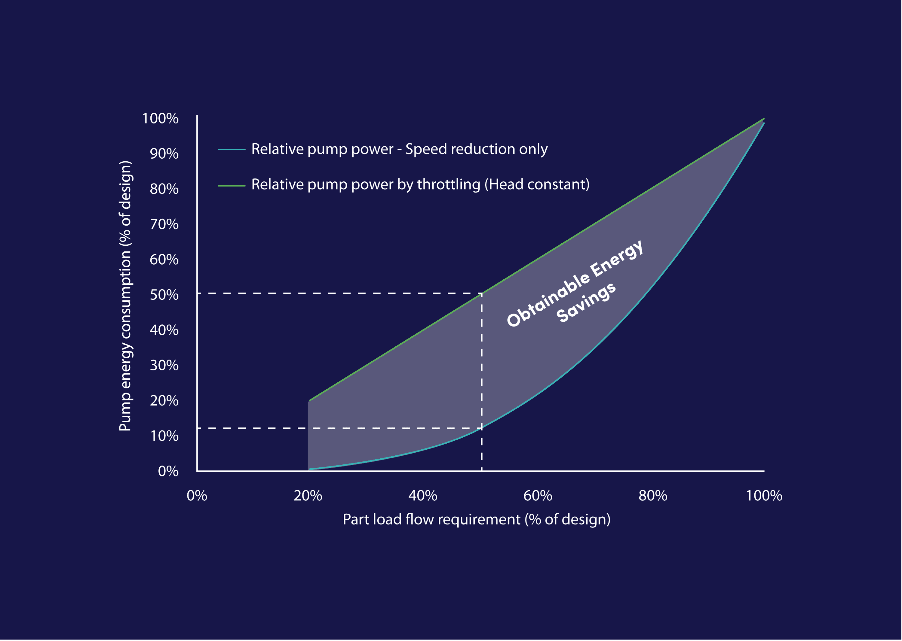 A flow reduction of 50%, will reduce the pump energy to between 50 and 12.5%