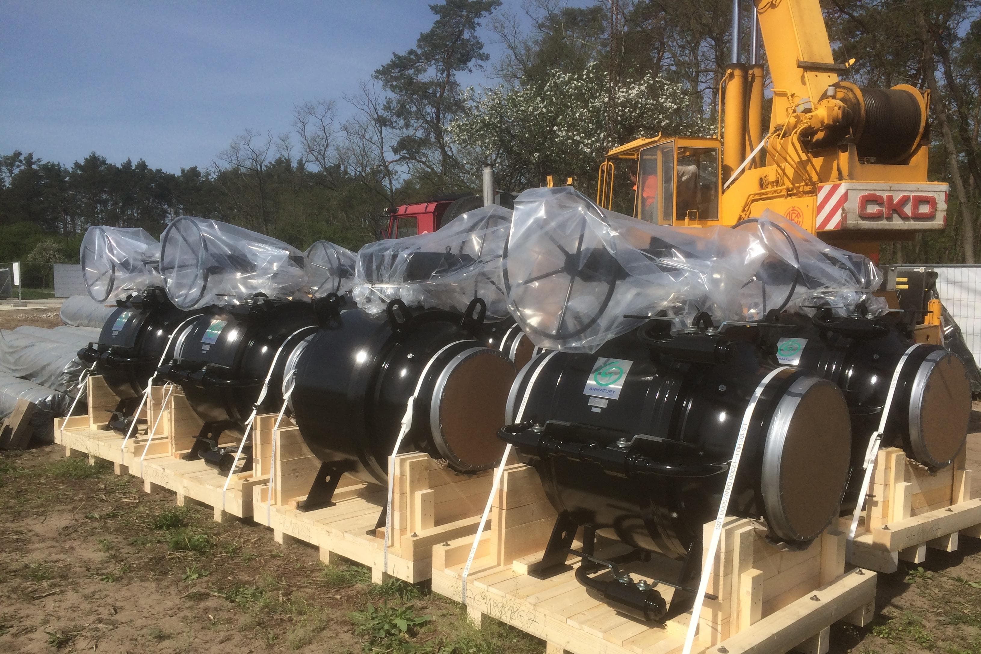 A total of 29 ball valves were shipped, six of which were of the DN 1400 clearance just mentioned. Another nine DN 1200 ball valves were equipped with hydropneumatic actuators and 14 DN 700 ball valves with manual gearboxes.