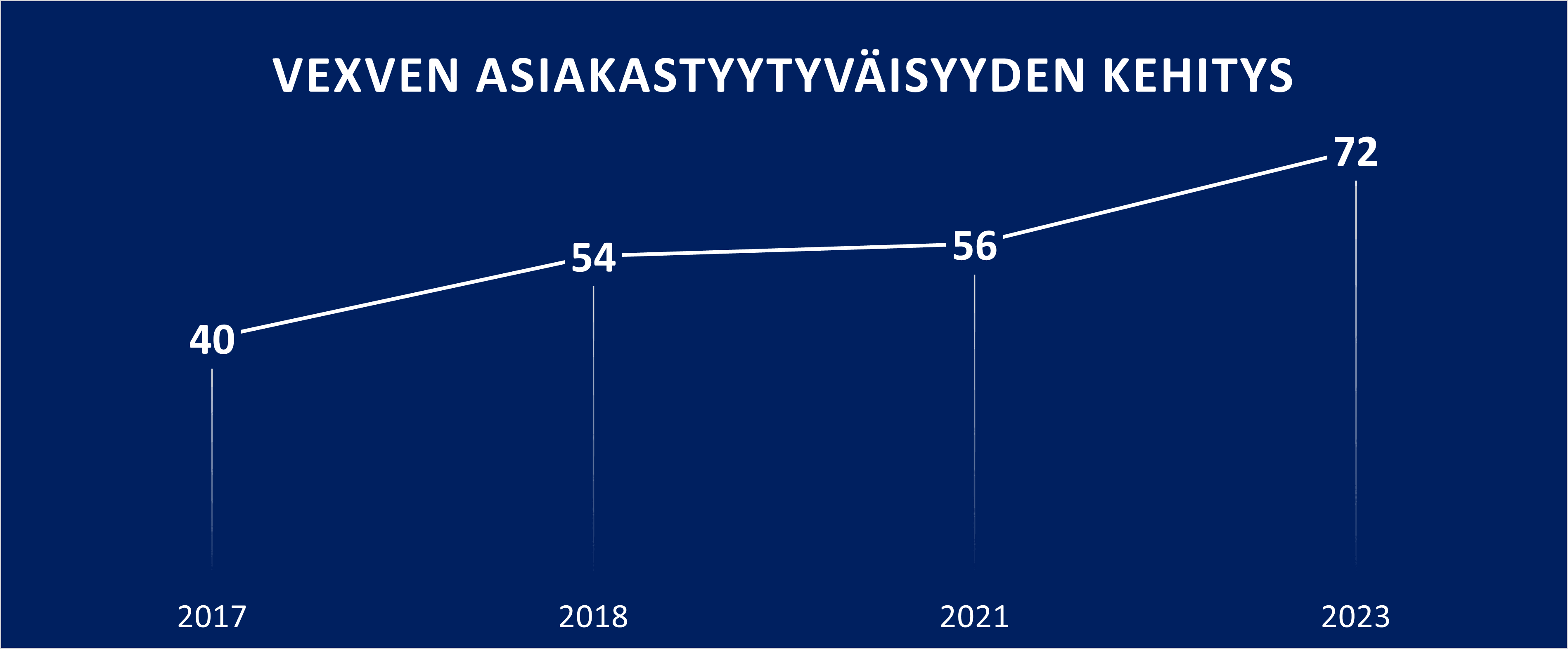 Viimeisen kuuden vuoden aikana Vexven asiakastyytyväisyydessä onkin nähty huimaa kehitystä. NPS-arvosteluasteikolla -100...+100 yleisarvosanamme vuoden 2023 asiakastyytyväisyystutkimuksesta oli peräti 72! Tutkimuksen toteuttaneen B2B-kyselyiden yleiskeskiarvo on 37, mikä kertoo myös jotain tuloksen erinomaisuudesta.