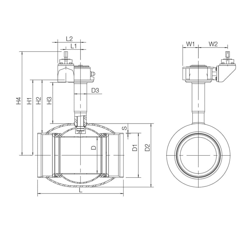 | DN | PN | Tuotenro. | D | D1 | D2 | D3 | H1 | H2 | H3 | H4 | L | L1 | L2 | S1 | S2 | W1 | W2 | Kg |