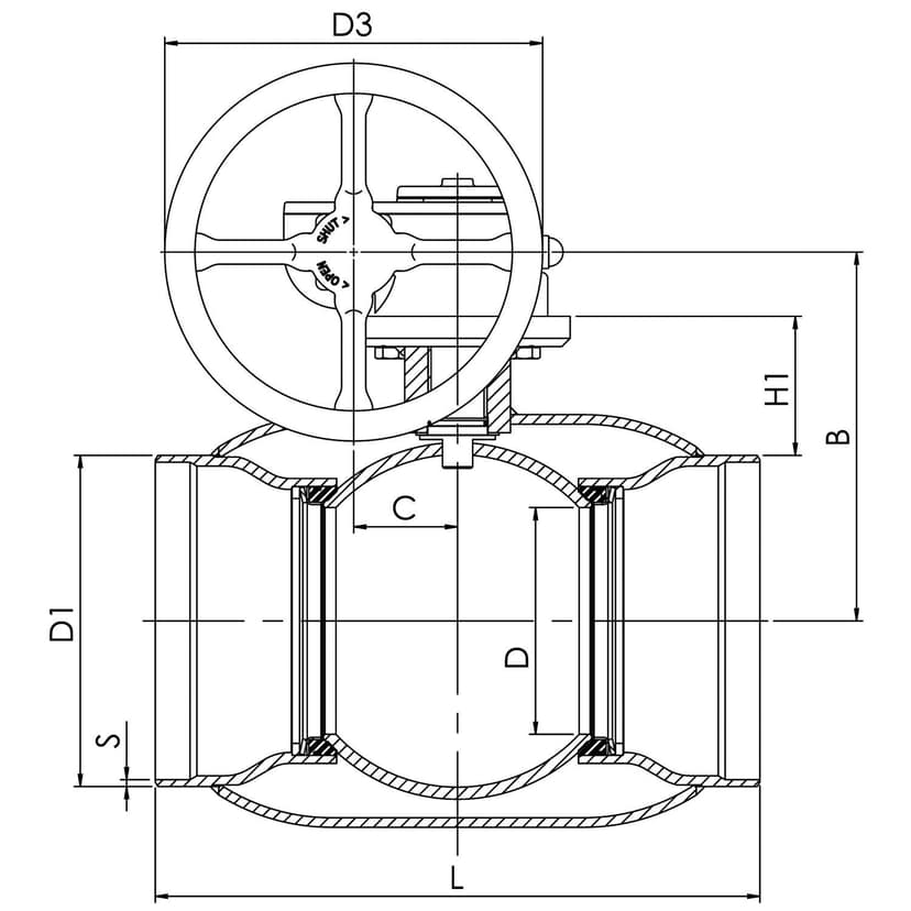 | DN | PN | Tuotenro. | LVI | A | B | C | D | D1 | D2 | D3 | E | H1 | L | S | Kg |